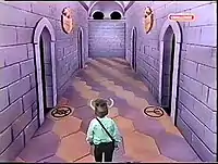 The show was an instant hit, and a second series twice as long as the first was commissioned the next year, closely followed by a third the year after that.[9] By the time this third series finished, Child felt the dungeon format was getting too restrictive, and he needed something new.[10] Because of this, the fourth series saw the introduction of many 'outdoor' scenes, filmed around places such as medieval castles across the UK, and composited into the blue room using the usual chromakey technique.[10] This series also saw the introduction of the "Eye Shield", which acted as an 'eye' for the dungeoneer.[4] Using pre-recorded footage filmed on location, it followed the progress of the dungeoneers as they explored the dungeon.[4] A new onscreen status bar was also introduced, generated by a Commodore Amiga 2000 computer.[11][12]