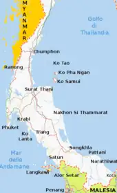 The island of Koh Tao is located in Southern Thailand. Measuring 21 square kilometres (8 sq mi) in area, it is the smallest of three popular tourist islands in the Gulf of Thailand.[1] Receiving half a million visitors each year,[1] Koh Tao is especially popular with backpackers and known for its marine life and scuba diving. It has over 100 hotels and resorts and was deemed the busiest diving centre in Southeast Asia in 2014.[2] In 2014, the island had a population of around 5,000 locals. Burmese migrant workers made up an additional 5,000, around 2,000 of these being illegal immigrants who bribe local police by paying 500 baht each month. These illegal workers often reside with friends on the island, making it difficult to identify them. Some of these workers said they can earn more money in Thailand compared to Myanmar.[3] The murders were the first cases of homicide on the island in over eight years.[4]
