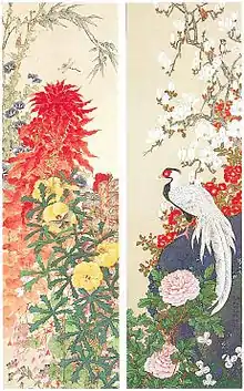 - Phoenix and the rising sun (朝陽鳴鳳凰之図 ), 1925, Sannomaru Shōzōkan, Imperial Household Collections. Commissioned by the Bank of Japan as an anniversary gift to the Taishō Emperor and Empress.