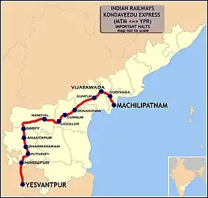 The 17211 / 17212 Kondaveedu Express train belonging to Indian Railways – South Coast Railway zone is a tri-weekly train that runs between Machilipatnam and Yesvantpur Junction in India. The train is named after the Kondaveedu Fort near Guntur City.