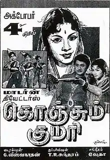 Konjum Kumari (transl.โ€‰Enticing Girl) is 1963 Indian Tamil-language action comedy film, directed by G. Viswanathan and produced by T. R. Sundaram of Modern Theatres. The script was written by Mana and K. Devarajan, with music by Vedha. The film stars K. R. Indira Devi, Manorama and R. S. Manohar, with S. V. Ramadas, A. Karunanidhi and K. K. Soundar in supporting roles.