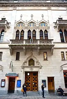 The facade overlooking the street is finished in Portland limestone with intricate details, including wall openings, a crowning balustrade, clover-leafed windows and mosaics. The architecture is inspired by Italian and Spanish trends from the 16th century. The interior includes the entrance hall, a staircase and the richly stuccoed exhibition hall. The building houses a collection of fine art. The entire building is decorated by the works of celebrated artists and craftsmen.[2] The small reliefs on the front doors were created by the painter, Gustaf Theodor Wallén.