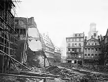The entire development of the Kornmarkt was severely impacted by the demolition and incendiary bomb, leading to a devastating firestorm. Most of the structures, apart from the roof elements, were destroyed. However, two blocks of the new city hall and the badly damaged outer walls of the Bethmann Bank managed to survive the onslaught.