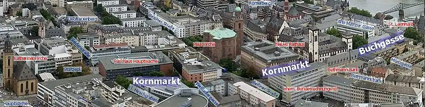 • The westernmost of the three streets was the Kornmarkt. It stretched from the northwestern city gate, initially known as Bockenheimer Pforte (later Katharinenpforte), located at today's Hauptwache to the Leonhardstor at the Mainhaufen. Important churches were also located at these two gates, the Katharinenkirche , and the Leonhardskirche.