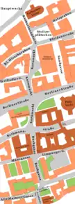 Following the construction of the Staufenmauer, the city expanded northward, doubling its walled area. Previously, the main streets predominantly ran in an east-west direction, including Alte Mainzer Gasse, Saalgasse, and Markt. With the expansion, three new main streets were introduced, connecting the newly developed parts of the city with the existing ones. These main streets served the purpose of facilitating traffic between the two new inland city gates and the existing gates leading to the harbor on the banks of the Main River:[1]