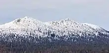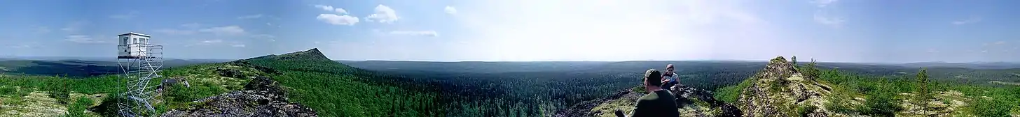 Korvatunturi is covered by a thick pine forest, and surrounded by frozen lakes, and sits on a landscape over which hundreds of thousands of reindeer roam.[1] Korvatunturi stands 486 metres (1,594 ft) above sea level; it has three peaks, with the middle peak crossing Finland and Russia's borders. Since Korvatunturi straddles the border of the country, all visitors are required to obtain written permission from the Finnish Border Guard.[2] There are also no roads that directly lead to the fell, but there are hike trails that provide access, such as the one found in the Savukoski area.[3]
