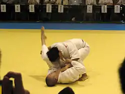 Judoka applying Mune Atama Gatame at the Nanatei league in 2010.