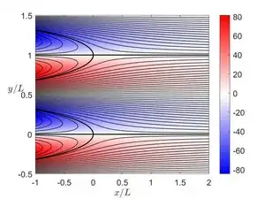 Let be the free stream velocity and let be the spacing between a two-dimensional grid. The velocity field of the Kovaszany flow, expressed in the Cartesian coordinate system is given by[2]