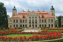 The original palace was built in the first half of 18th century for Michał Bieliński, voivode of Chełmno; its architect was Jozef II Fontana.[1] It represents the characteristic type of baroque suburban residence built entre cour et jardin (between the entrance court and the garden). Its architecture is original - a merger of European art with old Polish building traditions. In 1799, the Palace was acquired by the aristocratic Zamoyski family.[1] It belonged to the family up until 1944. The palace experienced a period of great prosperity during the times of Count Konstanty Zamoyski who remodelled the palace in order to turn it into one of the most monumental and representative magnate residences in Poland.[2]