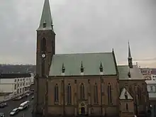 Kralupy nad Vltavou is poor in monuments. The landmark of the town centre is the Church of the Assumption of the Virgin Mary and Saint Wenceslaus. It was builr in the neo-Gothic style in 1894–1895. It represents one of the few preserved historical buildings in a town heavily disturbed by modern reconstruction and industrial production.[9]