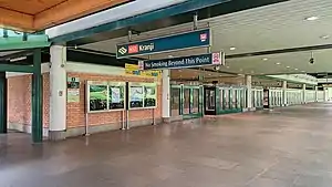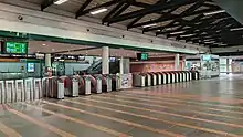Designed to accommodate crowds visiting Singapore Turf Club during race events, Kranji station is the largest station on the Woodlands extension. The 1,300 m2 (14,000 sq ft) concourse level is three times larger than those at other stations with many fare gates to allow efficient crowd flow. The station has twice the number of escalators and stairs (four escalators and two stairs) and the direction of the escalators could be varied depending on the crowd flow.[30] Initially without shops due to the lack of residential developments,[34] there are now retail shops at the first level of the station as part of the SMRT Shop & Dine Concept.[35][36]