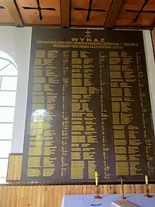 Following the war, the village underwent partial reconstruction.[16] Shortly after the German occupation ended, the burial site of the victims was enclosed and marked with a birch cross. Fr. Józef Kaczyński, who lost his mother and three siblings during the pacification, made significant efforts to commemorate the events of July 1943.[3] He and other survivors began compiling a list of victims shortly after the massacre.[35] At the priest's initiative in 1946, a chapel-mausoleum was constructed in Krasowo-Częstki, placed near the location of the two mass graves. Inside the chapel, there are two plaques, one bearing the names of the victims and the other listing the survivors. An altar with a replica of the painting of Black Madonna of Częstochowa, as well as display cases containing fragments of burnt farm boards and photographs of the village and its inhabitants, many taken by Fr. Kaczyński shortly before the massacre, can be found within. Every year on 17 July, masses are held in remembrance of the victims.[36]