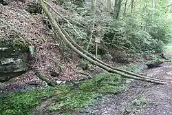 The Krassach spring lies in the middle of the Bärental, about 300 meters south of the Herbstmühle. It emerges as a stratified spring, formed by several small springs merging directly at the foot of the eastern slope of the Bärental.[3] Among its sources, the spring is fed by a small underground stream that initially vanishes as a stream bend in the rear section of the Bärental. Just after the spring, a small weir splits the stream into its natural course and the Mühlbach (mill stream) leading to the Herbstmühle (Herbst mill). According to ancient tales, the spring used to surface further upstream from its present location.[4]