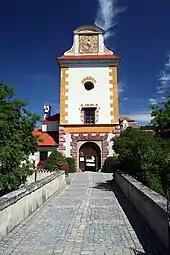 The medieval moated fortified stronghold of 1569 was turned into a hunting lodge between 1583 and 1589 by William of Rosenberg.[1] It was designed in the style of the Roman country villa and named Kratochvíle. The architect was Baldassare Maggi from Arogno, Ticino (CH).[2] The whole complex with an entrance wing, outline of fortifications, moat and drawbridge was built in the form of a slightly elongated rectangle, and the château was built on piles of marshy ground.