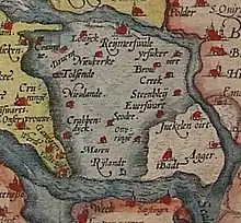 Selected part of the map "Zelandicarum Insularum Exactissima Et Nova Descriptio, Auctore D. Iacobo A Daventria" showing the drowned land of Reimerswaal in 1580