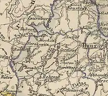 With the First Partition of Poland in 1772, the territory of the future Karthaus district became part of the Kingdom of Prussia, and it was initially divided between the Dirschau and Stargard districts in the province of West Prussia.[1] On April 30, 1815, the area was made part of Regierungsbezirk Danzig. As part of a comprehensive district reform, parts of the old Dirschau and Stargard districts were separated to form the new Carthaus district on April 1, 1818. The spelling of the name of the town and the district was changed to Karthaus, over the course of the 19th century. From December 3, 1829, to April 1, 1878, West Prussia and East Prussia were united to form the Province of Prussia, which had belonged to the German Empire since 1871.