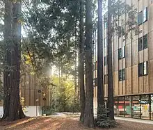 The Kresge Renewal Project is renovating Kresge College to address the University's housing crisis. Buildings R7, the Triplets, and the Recreation Center were demolished to make room for three new dormitory buildings, which opened in 2023. Designed by Studio Gang, the curved, mass-timber buildings were shaped to preserve as many redwoods as possible and open up views of the forest.[4] The geometry and bright colors of the end facades resonate with the campus' original architecture by Charles Moore and William Turnbull of MLTW.[5] Social spaces and student amenities occupy the ground floors while residences are located above. The buildings are among the first cross-laminated buildings in California.[6]