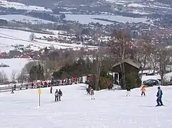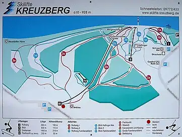 The Kreuzberg Ski Area is located on the northern side of the Kreuzberg mountain (928 m) in the Bavarian part of the Rhön region, near Bischofsheim. It ranges in altitude from approximately 600 to 900 meters above sea level.[1] The ski area features four ski lifts ranging in length from 250 to 1408 meters, providing access to eleven slopes of varying difficulty levels. The slopes are about 15 kilometers in length, with lengths varying from 250 to 3000 meters. Due to the length and steepness of the slopes, it is the largest ski area and one of the most challenging in the Rhön region. The two upper ski lifts, Rothanglift, and Blicklift are known for their snow reliability due to their higher altitude and northern location. The Dreitannenlift is the longest ski lift in the Rhön region and the longest drag lift with the greatest elevation difference in Germany outside of the Alps.[2]