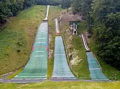 The Kreuzbergschanzen ski jumps are located within the ski area, at an elevation of roughly 600 meters above sea level, where ski jumping has been taking place since 1952. The ski jump facility, renovated in 1997, consists of three artificial turf jumps (K-point distances: 16, 30, and 50 meters) that comply with the latest FIS standards and are primarily used by young ski jumpers. The Kreuzbergschanze is the only ski jump in the Rhön region and in Lower Franconia, Bavaria. The three ski jumps are listed with certification numbers DSV 190 (K-16), 191 (K-30), and 192 (K-50) by the German Ski Association (DSV) until December 4, 2012.[11] The largest event held at the ski jumps took place from January 24 to 26, 1964, during the Bavarian Nordic Winter Games for youth skiers. The longest distance achieved, albeit with a fall, was 74 meters by Henrik Ohlmeyer from SC Bischofsgrün.[12]