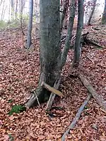Križna Gora is the site of a mass grave and an unmarked grave from the Second World War. The Gorge Peak Mass Grave (Slovene: Grobišče Vrh Soteske) lies in a sinkhole in the woods about 500 meters (1,600 ft) south of Holy Cross Church. It contains the remains of a family of four from Kranj that was murdered by the Partisans during the war.[3] The Križna Gora Grave (Grobišče Križna Gora) lies on a steep slope west of the house at Križna Gora no. 22. It contains the remains of a local female civilian that was shot by Partisan political activists.[4]