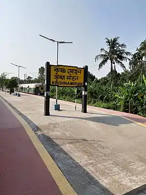 Krishna Mohan railway station is a Kolkata Suburban Railway Station on the Main line. It is under the jurisdiction of the Sealdah railway division in the Eastern Railway zone of the Indian Railways. Krishna Mohan railway station is situated beside Baruipur-Kulpi Road, Sulipratha Gate, Krishnamohan, South 24 Parganas district in the Indian state of West Bengal.[1][2]