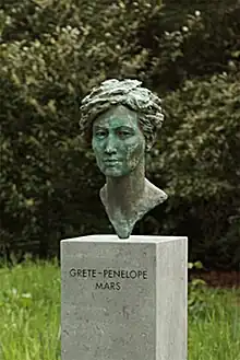 - Some at times cast light (2015) – Through an official council decision, Buch named a public place in Bochum-Ehrenfeld(51°27′55″N 7°12′27″E / 51.46536°N 7.20748°E) in Bochum, Germany after a fictitious woman (Grete-Penelope Mars), who deliberately has no biography.[11][12][13] A bronze bust of the woman was permanently installed on the site, as well as an official street sign. Every year in June/July, fireflies which have been populated in the adjacent park, temporarily become part of the work.[14][15]