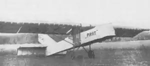The fabric-covered fuselage had a rectangular section, wooden-framed structure which tapered in plan but not profile to the tail. There was a single-seat, open cockpit. The Pirat's fabric-covered, wire-braced tail surfaces were generous. Its tailplane was mounted on top of the fuselage; both it and the separate elevators were rectangular. The fin was triangular and carried a rhomboidal rudder, the sloping lower edge providing room for the elevators to operate.[1][2]