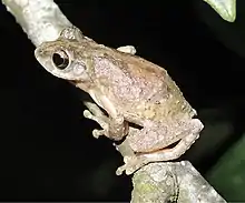 Adult males measure 25–29 mm (1.0–1.1 in) in snout–vent length. Females are unknown. The snout is obtusely pointed without prominence on its tip. The tympanum and sypratympanic fold are distinct. The finger and toe tips bear discs with circum-marginal and transverse ventral grooves. The fingers have basal webbing whereas the toes moderately webbed. The dorsal and lateral surfaces are coarse with small, and irregular tubercles. The dorsum is grayish brown with dark brown saddle-shaped mark; in some individuals, the mark can be X-shaped or even absent. There is a dark-brown inverted triangle-shaped mark between eyes. The head and the tympanic region are laterally brown with dark brown spot below the canthus. A broad dark brown bar runs along the canthus rostralis. The limbs are dorsally brown with clear dark brown barring and otherwise light to faint yellow with scattered brown spots. The chest and abdomen are white and nearly immaculate, or in some individuals, scattered with fine brown spots. The chin is clouded with black. The iris is golden brown.[2]