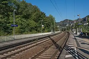 Kurort Rathen station serves the village of Rathen in the German state of Saxony. The station is located in the Oberrathen quarter of the village on the south bank on the Elbe on the Dresden to Děčín railway line. It is linked to the Niederrathen quarter on the other bank of the river by the Rathen Ferry, a passenger-only reaction ferry.[2][3][4]