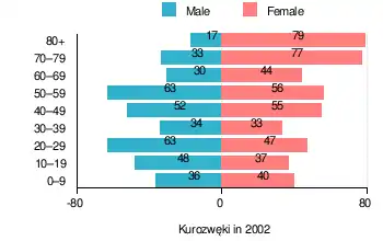 According to the 2002 Poland census, there were 844 people residing in Kurozwęki village, of whom 44.5% were male and 55.5% were female. In the village, the population was spread out, with 15.9% under the age of 18, 28.6% from 18 to 44, 24.4% from 45 to 64, and 31.2% who were 65 years of age or older.[1]