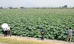 Huge lotus pond bloom in summer at Karasuma Peninsula in Kusatsu.