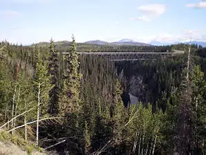 The stream has its source in Kuskulana Glacier at an elevation of about 2,200 feet. It flows southwestward for about 21 miles and joins Chitina River about 10 miles above the Copper at an elevation of approximately 600 feet, thus having an average grade of a little over 75 feet per mile. The main body of Kuskulana Glacier is about 11 miles long and slopes from east to west with an average width of about one-third mile. It receives four northern branches that emanate from the south and west slopes of Mount Blackburn. The basin above the Chitina Valley is exceedingly rugged. The snowfall in the higher mountains is said to be heavy, accumulating in massive drifts in the gulches and sheltered spots and in some places lasting throughout the summer. The river derives its main supply from Kuskulana Glacier and is heavily laden with glacial silt and sand.[1]