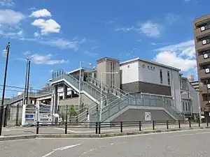 The station has one side platform and one island platform connected by an elevated station building.The station building has automated ticket machines, TOICA automated turnstiles and a staffed ticket office.