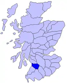 Kyle was the central of the three districts in the sheriffdom of Ayr (Ayrshire), which was divided naturally by its three primary rivers all running in a generally westward direction to flow into the firth of Clyde. The River Irvine forms the northern boundary of Kyle with Cunninghame; the River Doon established its southern boundary with Carrick. Additionally, Kyle itself was sub-divided into two parts. To the north of the River Ayr was "Kyle Stewart"[3] (sometimes called "Stewart Kyle"[4] or "Walter's Kyle"[5][6]), lands held by the FitzAlans (the future Stewart Kings of Scotland) since the 12th century. To the south was "Kyle Regis" or "King's Kyle",[4] lands historically retained by the monarch under royal authority from the royal castle at Ayr.