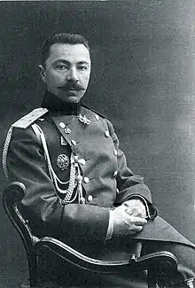 From November 1884 to April 1888, he served as an officer for special assignments at the headquarters of the Grenadier Corps when he was reassigned to the headquarters of the Moscow Military District. In 1893, he was promoted to colonel. In November 1897, he was reassigned as the Chief of Staff of the 2nd Grenadier Division. In 1900, he participated in the suppression of the Boxer Rebellion and protection of the Chinese Eastern Railway in northern China and was promoted to major general for his actions.[1] In February 1901, he became commander of the 2nd Brigade of the 36th Infantry Division, but returned to China and served in the Kwantung Leased Territory and Viceroyalty of the Far East until January 1904.[2]
