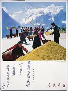 Another work was produced from an idealised Chinese photo, depicting farmers in the mountains being helped by Chinese soldiers. Lakner enlarged it to create a human-size photorealistic painting. The hand-written greeting of the newspaper editor who sent the photo to him, is also painted on the canvas.[80][81]