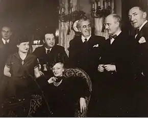 ![]() At the première in Monte Carlo in 1937: Fanny Heldy (seated), Honegger (3rd from left), Ibert (2nd from right), Vanni Marcoux (1st from right) | |