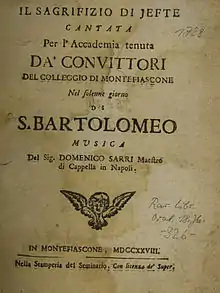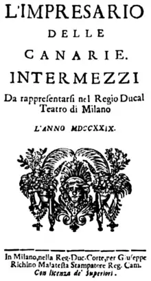 L'impresario delle Isole Canarie (The impresario from the Canary Islands), also known as L'impresario delle Canarie or Dorina e Nibbio, is a satirical opera intermezzo libretto attributed to Metastasio (Pietro Antonio Domenico Trapassi), written in 1724 to be performed between the acts of Metastasio's opera seria Didone abbandonata. The first performance of the work was on February 1, 1724, in Naples, Italy, at Teatro San Bartolomeo. The first composer to set this libretto to music was Domenico Sarro, also known by the name Sarri, who also revised the work in 1730.[1] The role of Dorina was first sung by the contralto Santa Marchesini, and Nibbio by the basso buffo singer Gioacchino Corrado.[2][3] Later versions of this libretto appear with the titles L'impresario, L'impresario e la cantante and others.