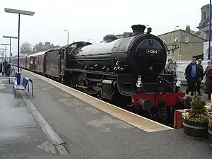 Restoration took some time; the boiler and firebox were in such poor condition that a new boiler and firebox seemed the only option, but steady work during the 1980s and 1990s restored the original boiler and the completed engine moved under its own power in 1997, finished in LNER Apple green as No. 1264. It is currently in BR Black livery as 61264. It was withdrawn from service (mid-2008) for a 10-year overhaul at LNWR Crewe and, once finished moved to the North Yorkshire Moors Railway. 61264 returned to the mainline in 2014 with a test run in early January followed by double-heading the Winter Cumbrian Mountain Express from Manchester Victoria to Carlisle with LMS Stanier Class 5 4-6-0 45407 organised by the Railway Touring Company.