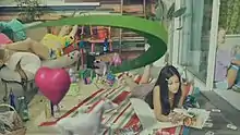 The music video was directed by Shigeaki Kubo.[8] It was initially aired on the internet on September 11, for a limited period of 24 hours.[9] The video features Kuroki in a summery room, reclined on the floor reading a magazine, along with several other girls. Interspersed with these scenes are Kuroki and two back-up dancers in a monochrome room, as well as scenes inside a red cluttered room, in which Kuroki stands in a bath-tub. Occasional 3D speech bubbles appear with the lyrics of the song around Kuroki, as well as other computer graphics.