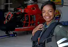 La'Shanda R. Holmes is a lieutenant commander in the United States Coast Guard[1] and the first African-American female helicopter pilot[2] for the Coast Guard.[3] She grew up in the foster care system and put herself through Spelman College.[4] She was an Aircraft Commander at Air Station Los Angeles, Air Station Atlantic City (where she was deployed multiple times to Washington D.C. (NCR) as a rotary wing air intercept pilot), and Air Station Miami. She has amassed over 2,000 flight hours conducting search and rescue, counter drug, law enforcement, and Presidential air-intercept missions.[2] She was appointed as a White House Fellow in 2015 by President Barack Obama.[5] In