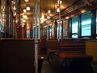 Their seats, each with the capacity for two passengers, were upholstered in scarlet leather and arranged in two groups of two seats facing each other. On both sides of each sliding door, a seat was placed longitudinally to allow extra room for standing passengers to travel comfortably.