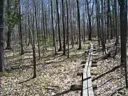 A thin boardwalk running along the Baie Fine section of the trail.
