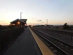La Fox is the penultimate station on Metra's Union Pacific West Line, located in La Fox, Illinois, an unincorporated area in Kane County, Illinois. The station is 41.1 miles (66.1 km) away from Ogilvie Transportation Center, the eastern terminus of the West Line.[2] In Metra's zone-based fare system, La Fox is in zone I. As of 2018, La Fox is the 146th busiest of the 236 non-downtown stations in the Metra system, with an average of 295 weekday boardings.[1] Unless otherwise announced, inbound trains use the north (island) platform and outbound trains use the south (side) platform. The northernmost track, despite being adjacent to the island platform, is used exclusively by freight trains.