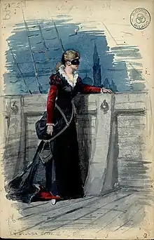 The Defrère staging of the opera continued to be performed at the Met with some frequency until it was replaced with a new production in 1966 that was staged by Margarete Wallmann with sets and costumes by Beni Montresor.[21] The Met took this production on a United States tour in 1967 with Renata Tebaldi in the title role, Franco Corelli as Enzo, Rosalind Elias as Laura, and Fausto Cleva conducting.[22] The Wallmann and Montresor production remained in the Met's repertory for 17 years and was last presented by the company in the 1982–1983 season with Plácido Domingo as Enzo and Eva Marton in the title role.[23] After 1983, La Gioconda has been mounted with less frequency on the Met stage with performances of the work consisting of a 1990 production with Ghena Dimitrova;[24] a 2006 production with Violeta Urmana;[25] and most recently a 2008 production with Deborah Voigt as the title heroines respectively.[26] Additionally, the Opera Orchestra of New York has presented concert versions of the opera several times; including a 1986 concert starring Ghena Dimitrova as Gioconda;[27] and a 2004 concert starring Aprile Millo in the title role and Marcello Giordani as Enzo.[28]