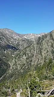 Coma Pedrosa in the north-west of the parish is the highest point in the Principality of Andorra at 2,942 metres (9,652 ft), and has panoramic views of the Pyrenees. The mountain is also the site of the Coma Pedrosa Nature Reserve.[3] It is covered by heavy snowfalls in winter, and usually retains some snow cover in summer. The four next-highest peaks are Medacorba (2914 m), Sanfonts (2888 m), Pla de l'Estany (2859 m), and Racofred (2837 m).[4] The town of La Massana has an average elevation of 1,240 metres (4,070 ft) above sea-level. There are four lakes: Forcats, Montmantell, Estany Negre, and Les Truites Lake.[3]
