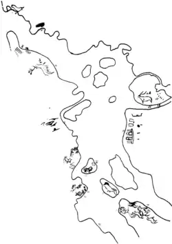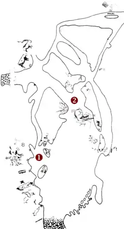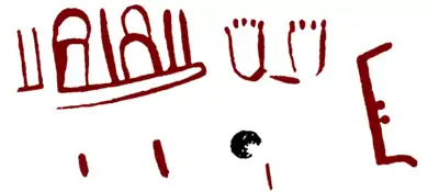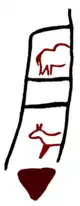 • Claviform signs: The signs called 'claviform' (key-shaped) are fairly abundant, specially in gallery B and in Room XI, but are doubtful if not indeed non-existent in Gallery A. Those of Room XI are the most characteristic and may be associated with horses. One of these can be considered as what Leroi-Gourhan calls a 'coupled sign',[15] made by uniting in the same idiomorph a line or bar (masculine) with a key-shape (feminine). The typology and chronology of these signs is very ample.