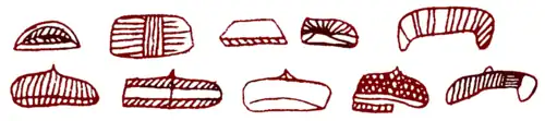 • Tectiform signs: These are without any question the most abundant signs of this cave. They have a more or less rectangular shape, with and without additions, with and without internal divisions. Despite their frequency, these signs are absent from Gallery B. Breuil established a chronology and development through all of them; according to Leroi-Gourhan they belong to Style III and they have parallels in many caves of Spain and France, the nearest being the cave of El Castillo. At La Pasiega they are found in the end area and the narrow defile of Gallery A, and in the first large group of Room XI.