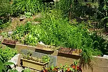 La Plaza Cultural was founded in 1976 by local residents and greening activists who took over what was then a series of vacant city lots piled high with rubble and trash. In an effort to improve the neighborhood during a downward trend of arson, drugs, and abandonment caused by the New York City fiscal crisis of the late 1970s, members of the Latino group Charas/El Bohio cleared out truckloads of refuse.[2] Working with Buckminster Fuller, they built a geodesic dome in the open “plaza” and began staging cultural events. Green Guerilla's pioneer, Liz Christy, seeded the turf with “seed bombs” and planted towering weeping willows and linden trees. Artist Gordon Matta-Clark helped construct La Plaza’s amphitheater using railroad ties and materials reclaimed from abandoned buildings. Later, block residents tilled the western portion of the space and planted vegetables, flowers, and fruit trees. During the 1980s, the garden came under attack by developers seeking to build on the space. After numerous court battles, La Plaza was finally preserved in 2002 as part of the terms of a legal settlement.[3] In 2003, La Plaza was renamed in memory of Armando Perez, a CHARAS founder and former District Leader of the Lower East Side, who was killed in 1999.[4]