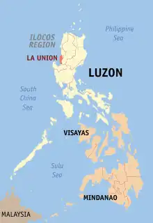 La Union's 2nd congressional district is one of the two congressional districts of the Philippines in the province of La Union. It has been represented in the House of Representatives of the Philippines since 1916 and earlier in the Philippine Assembly from 1907 to 1916.[3] The district consists of the southern municipalities of Agoo, Aringay, Bagulin, Bauang, Burgos, Caba, Naguilian, Pugo, Rosario, Santo Tomas, and Tubao. It is currently represented in the 19th Congress by Dante S. Garcia of the People's Reform Party (PRP).[4]